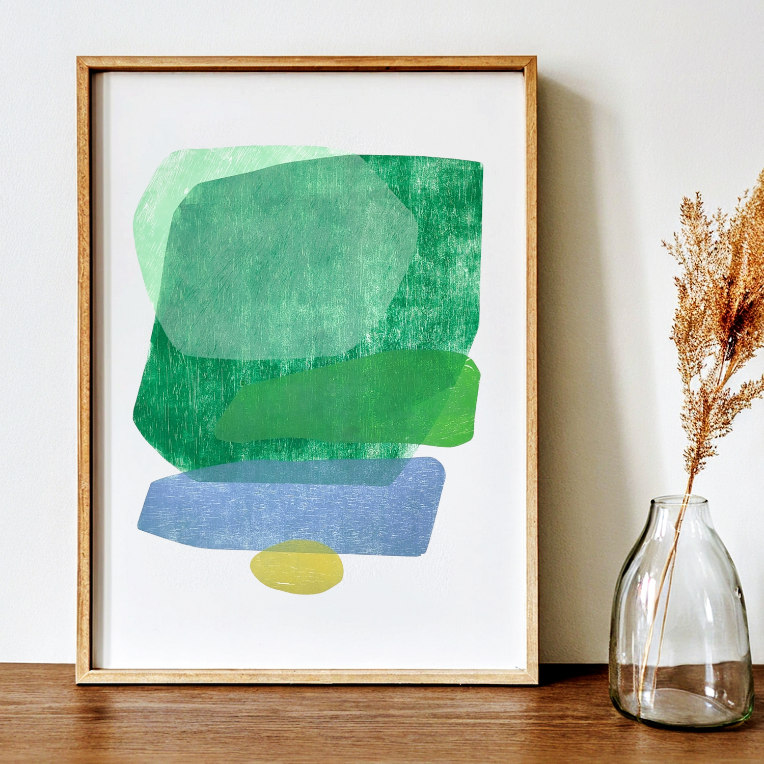 My collections of monoprints are created from a library of woodblock plates. Each print is different in it’s overlapping and combining of plates, as well as it’s colors and ink density. I love watching how the plates interact with one another and change as they are paired with different plates in different colors. The shifting color and tones of each print come from the patina of ink adhering to the plate after previous prints. The more plates on a monoprint the more difficult the print is, with more chances for a stray mark, a mis-registered plate or simply a bad overlap. Some prints can have up to 12 plates interacting and engaging with one another. Each one of my monoprints is a beautiful record of a moment captured in color and texture.